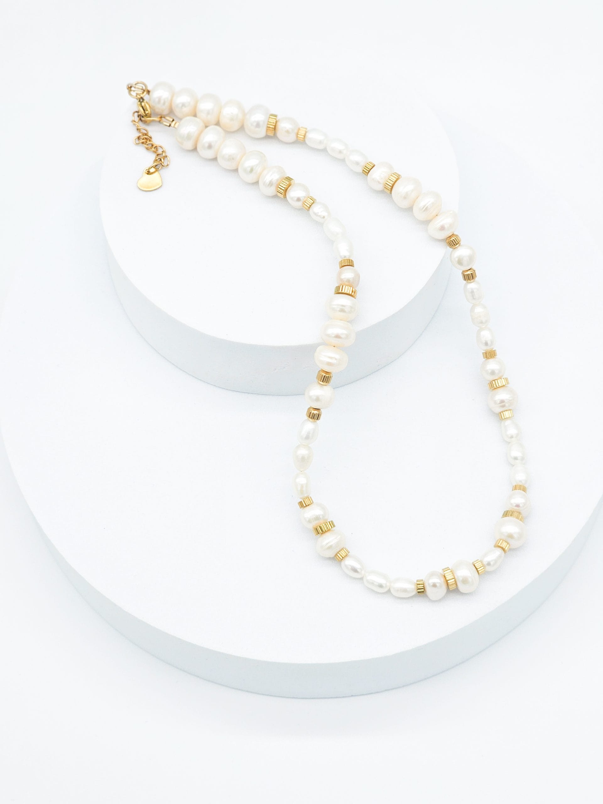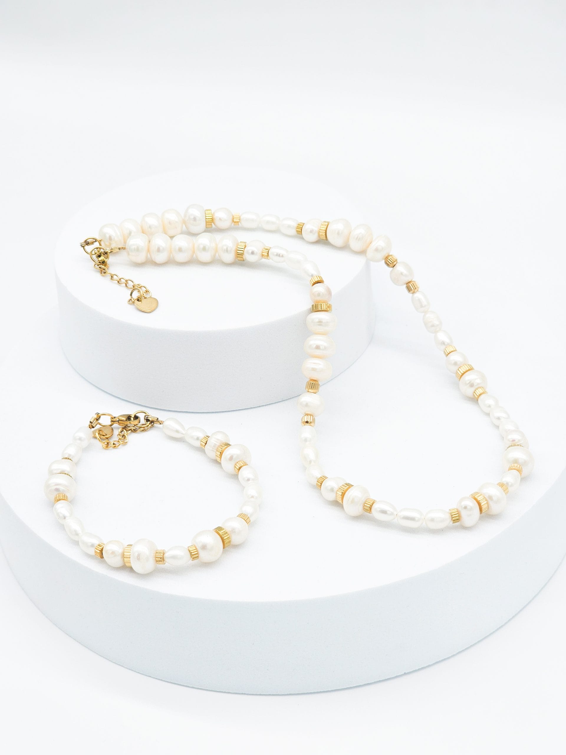 Kaklo vėrinys ir apyrankė ,,Fantazija” pagaminti iš natūralių gėlavandenių perlų ir nerūdijančio plieno intarpų. Rankų darbo papuošalų derinys vienetinis, tad juo pasipuošusi būsite išskirtinė!